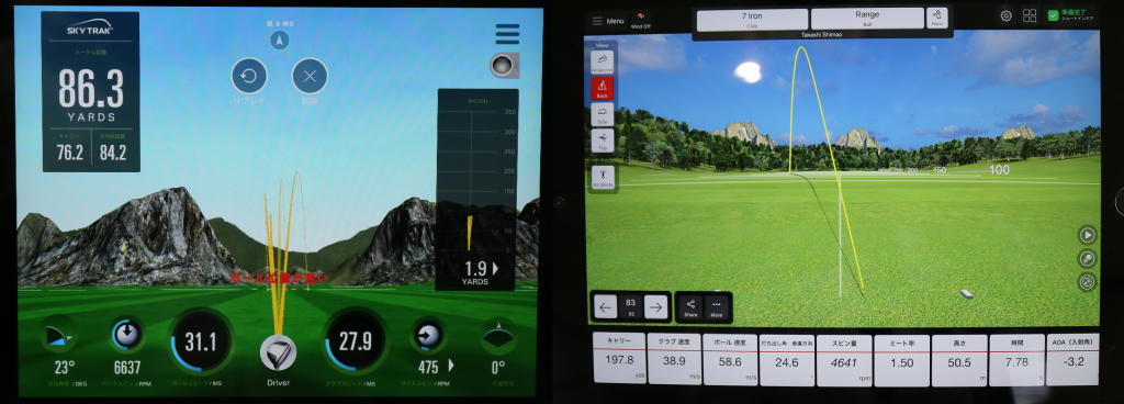 弾道計測機として、スカイトラックとMevo Plusを導入しておりインドアでありながら弾道がビジュアルで確認でき、飛距離だけでなくスピン量やヘッドスピード、ボールスピード、打ち出し角度なども把握できます。
